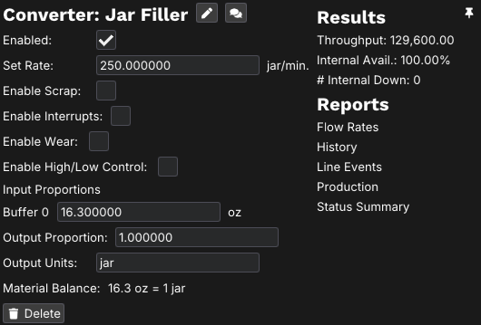 Next let's look at our jar filler. from the video, we know it can fill up to 250 jars per minute. doing a quick search, the most common size for a jar of peanut butter is 16.3 oz. When we left click on converter 0 in the example above, we can fill in the information as shown to reflect our example. Clicking the pencil icon besides the converter name allows us to rename it to "Jar Filler"
