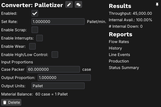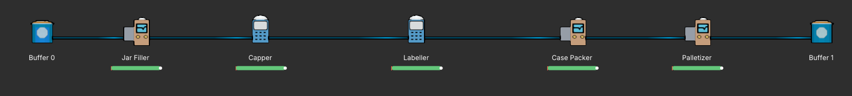 Finally, these cases will be packed onto pallets to be shipped. For our palletizer step, let's assume we can fit 60 cases on a pallet, and that our material can be palletized at up to one pallet per minute. This leaves our final node before our ending buffer looking like this.